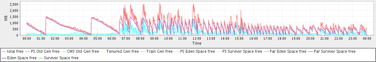 avg(total free) = 743.87 avg(PS Old Gen free) = 543.75 avg(CMS Old Gen free) = 0.00 avg(Tenured Gen free) = 0.00 avg(Train Gen free) = 0.00 avg(PS Eden Space free) = 189.17 avg(PS Survivor Space free) = 10.95 avg(Par Eden Space free) = 0.00 avg(Par Survivor Space free) = 0.00 avg(Eden Space free) = 0.00 avg(Survivor Space free) = 0.00