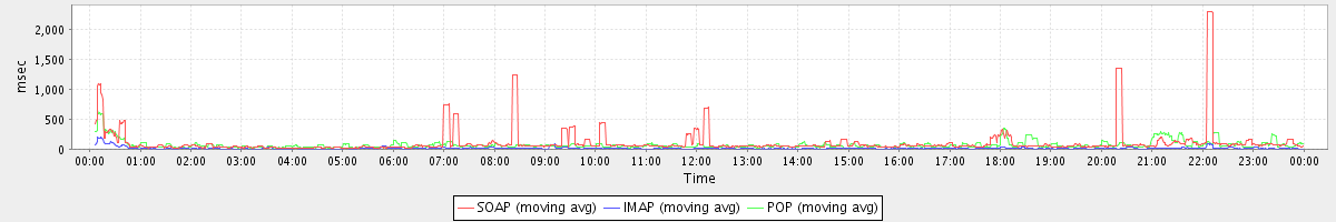 avg(SyncGalRequest) = 3804.80 avg(GetFreeBusyRequest) = 942.42 avg(SearchGalRequest) = 653.04 avg(ImportContactsRequest) = 4443.00 avg(BackupRequest) = 386964.00 avg(FolderActionRequest.empty) = 5195.02 avg(BackupQueryRequest) = 1023.20 avg(GetQuotaUsageRequest) = 2913.00 avg(ConvActionRequest.delete) = 474.47 avg(SendMsgRequest) = 602.16