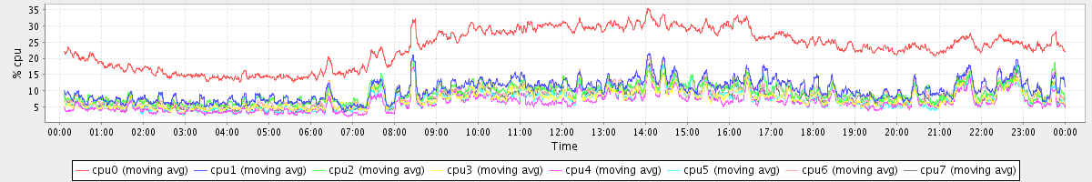 avg(cpu0) = 23.35 avg(cpu1) = 10.25 avg(cpu2) = 9.35 avg(cpu3) = 7.60 avg(cpu4) = 6.39 avg(cpu5) = 7.20 avg(cpu6) = 8.89 avg(cpu7) = 8.01