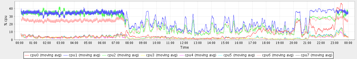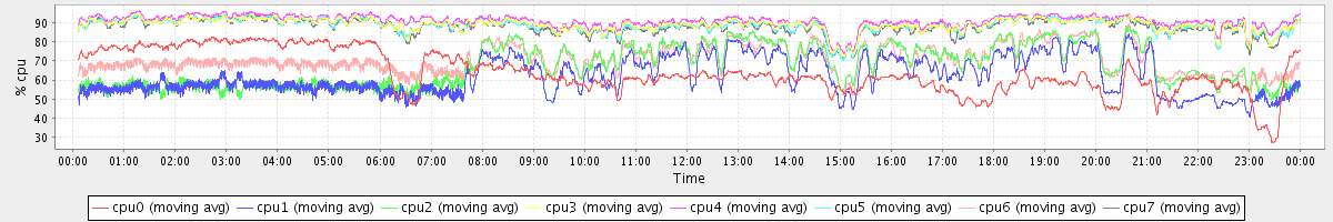 avg(cpu0) = 6.64 avg(cpu1) = 25.40 avg(cpu2) = 21.61 avg(cpu3) = 2.51 avg(cpu4) = 2.14 avg(cpu5) = 2.89 avg(cpu6) = 18.02 avg(cpu7) = 2.96