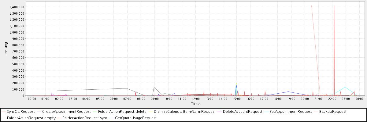 avg(SyncGalRequest) = 3106.43 avg(CreateAppointmentRequest) = 3605.34 avg(FolderActionRequest.delete) = 6502.00 avg(DismissCalendarItemAlarmRequest) = 2972.68 avg(DeleteAccountRequest) = 9596.91 avg(SetAppointmentRequest) = 2704.25 avg(BackupRequest) = 721149.00 avg(FolderActionRequest.empty) = 12466.88 avg(FolderActionRequest.sync) = 13402.50 avg(GetQuotaUsageRequest) = 2945.00