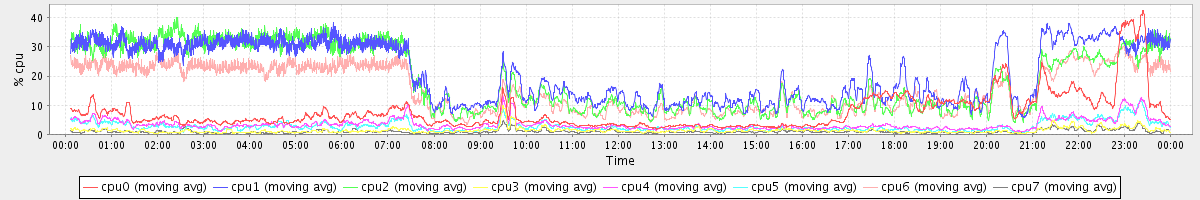 avg(cpu0) = 5.41 avg(cpu1) = 23.44 avg(cpu2) = 18.31 avg(cpu3) = 29.57 avg(cpu4) = 8.49 avg(cpu5) = 28.74 avg(cpu6) = 24.94 avg(cpu7) = 43.04
