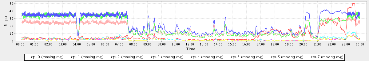 avg(cpu0) = 21.32 avg(cpu1) = 8.41 avg(cpu2) = 7.59 avg(cpu3) = 6.41 avg(cpu4) = 5.37 avg(cpu5) = 5.81 avg(cpu6) = 7.09 avg(cpu7) = 5.95