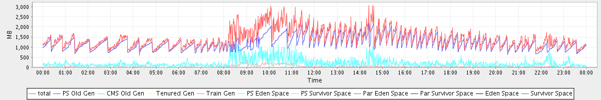avg(total) = 1429.49 avg(PS Old Gen) = 1194.67 avg(CMS Old Gen) = 0.00 avg(Tenured Gen) = 0.00 avg(Train Gen) = 0.00 avg(PS Eden Space) = 204.93 avg(PS Survivor Space) = 29.89 avg(Par Eden Space) = 0.00 avg(Par Survivor Space) = 0.00 avg(Eden Space) = 0.00 avg(Survivor Space) = 0.00
