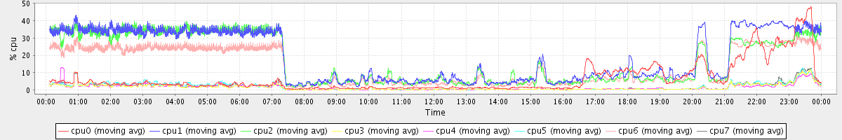 avg(cpu0) = 6.61 avg(cpu1) = 19.07 avg(cpu2) = 17.29 avg(cpu3) = 1.51 avg(cpu4) = 1.47 avg(cpu5) = 1.87 avg(cpu6) = 13.61 avg(cpu7) = 1.79