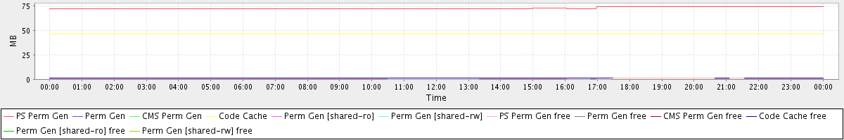 avg(PS Perm Gen) = 73.06 avg(Perm Gen) = 0.00 avg(CMS Perm Gen) = 0.00 avg(Code Cache) = 46.53 avg(Perm Gen [shared-ro]) = 0.00 avg(Perm Gen [shared-rw]) = 0.00 avg(PS Perm Gen free) = 0.61 avg(Perm Gen free) = 0.00 avg(CMS Perm Gen free) = 0.00 avg(Code Cache free) = 1.16 avg(Perm Gen [shared-ro] free) = 0.00 avg(Perm Gen [shared-rw] free) = 0.00