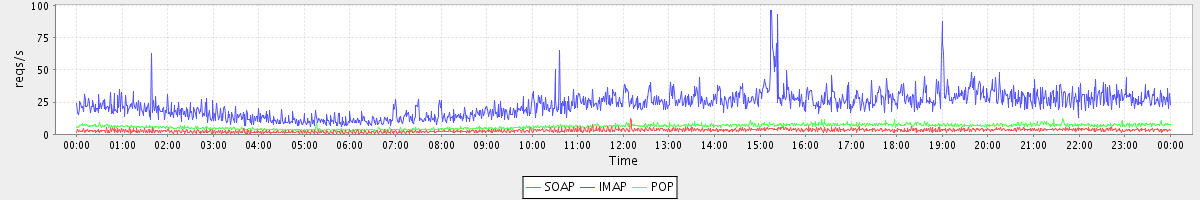 Host zm03.stanford.edu: Mailboxd: Request Rate by Client Protocol