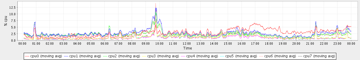 avg(cpu0) = 25.88 avg(cpu1) = 10.18 avg(cpu2) = 8.87 avg(cpu3) = 8.02 avg(cpu4) = 6.53 avg(cpu5) = 8.22 avg(cpu6) = 9.84 avg(cpu7) = 9.07