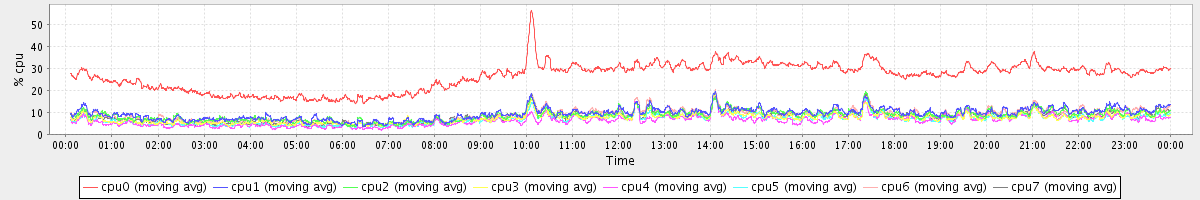 avg(cpu0) = 26.44 avg(cpu1) = 9.39 avg(cpu2) = 8.66 avg(cpu3) = 7.42 avg(cpu4) = 6.28 avg(cpu5) = 6.98 avg(cpu6) = 8.98 avg(cpu7) = 8.03
