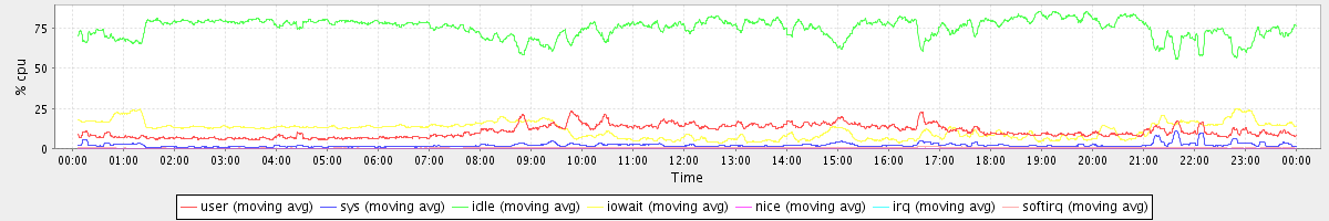 avg(user) = 10.70 avg(sys) = 1.98 avg(idle) = 75.33 avg(iowait) = 11.47 avg(nice) = 0.00 avg(irq) = 0.05 avg(softirq) = 0.46