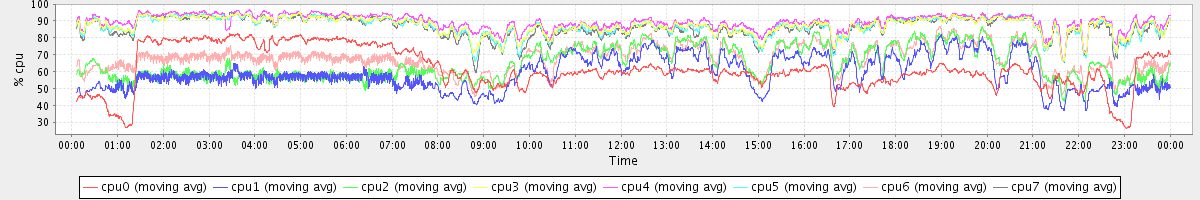 avg(cpu0) = 61.42 avg(cpu1) = 59.10 avg(cpu2) = 64.83 avg(cpu3) = 87.20 avg(cpu4) = 89.45 avg(cpu5) = 86.80 avg(cpu6) = 67.85 avg(cpu7) = 86.04