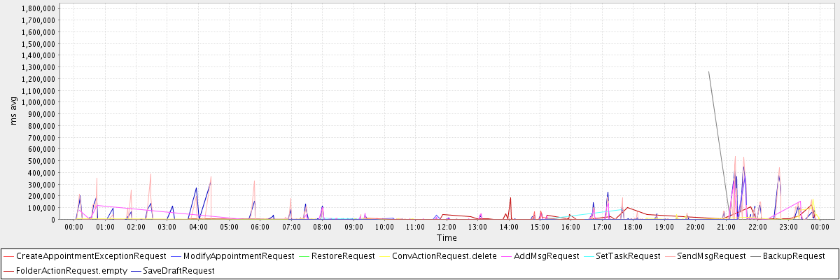 avg(CreateAppointmentExceptionRequest) = 8465.32 avg(ModifyAppointmentRequest) = 12316.39 avg(RestoreRequest) = 1759851.00 avg(ConvActionRequest.delete) = 5553.69 avg(AddMsgRequest) = 7471.25 avg(SetTaskRequest) = 10410.00 avg(SendMsgRequest) = 13265.97 avg(BackupRequest) = 642394.50 avg(FolderActionRequest.empty) = 20497.86 avg(SaveDraftRequest) = 13207.65