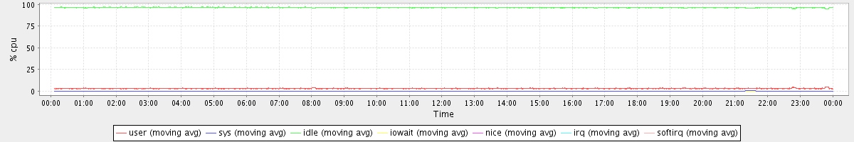 avg(user) = 3.11 avg(sys) = 0.21 avg(idle) = 96.58 avg(iowait) = 0.07 avg(nice) = 0.00 avg(irq) = 0.00 avg(softirq) = 0.00