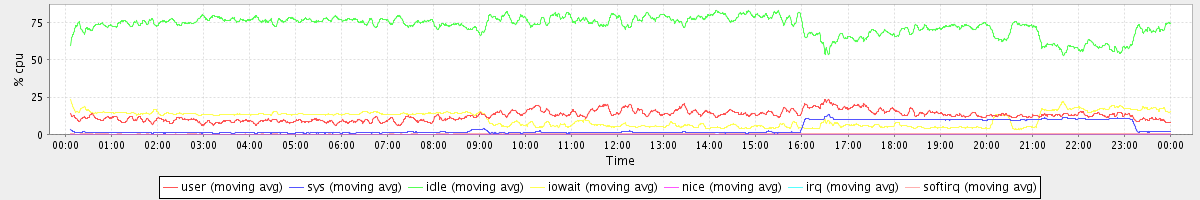 avg(user) = 12.55 avg(sys) = 3.91 avg(idle) = 72.79 avg(iowait) = 10.33 avg(nice) = 0.00 avg(irq) = 0.05 avg(softirq) = 0.37