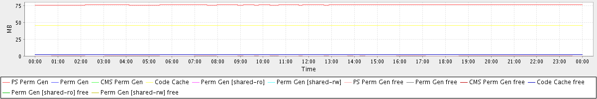 avg(PS Perm Gen) = 76.04 avg(Perm Gen) = 0.00 avg(CMS Perm Gen) = 0.00 avg(Code Cache) = 45.28 avg(Perm Gen [shared-ro]) = 0.00 avg(Perm Gen [shared-rw]) = 0.00 avg(PS Perm Gen free) = 0.29 avg(Perm Gen free) = 0.00 avg(CMS Perm Gen free) = 0.00 avg(Code Cache free) = 2.41 avg(Perm Gen [shared-ro] free) = 0.00 avg(Perm Gen [shared-rw] free) = 0.00