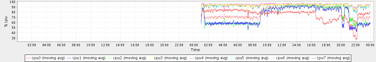avg(cpu0) = 75.43 avg(cpu1) = 72.58 avg(cpu2) = 74.25 avg(cpu3) = 93.73 avg(cpu4) = 94.56 avg(cpu5) = 93.55 avg(cpu6) = 79.96 avg(cpu7) = 92.98