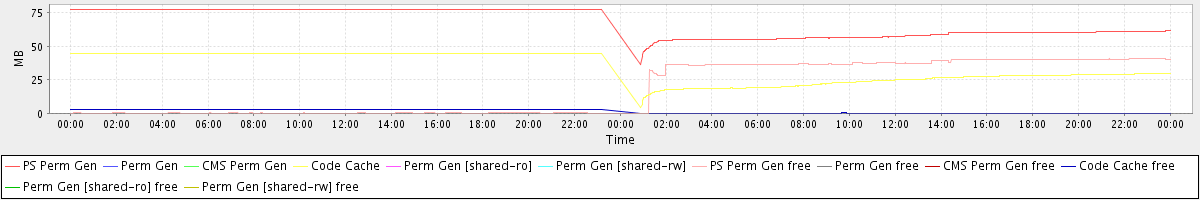 avg(PS Perm Gen) = 67.75 avg(Perm Gen) = 0.00 avg(CMS Perm Gen) = 0.00 avg(Code Cache) = 34.47 avg(Perm Gen [shared-ro]) = 0.00 avg(Perm Gen [shared-rw]) = 0.00 avg(PS Perm Gen free) = 18.88 avg(Perm Gen free) = 0.00 avg(CMS Perm Gen free) = 0.00 avg(Code Cache free) = 1.52 avg(Perm Gen [shared-ro] free) = 0.00 avg(Perm Gen [shared-rw] free) = 0.00
