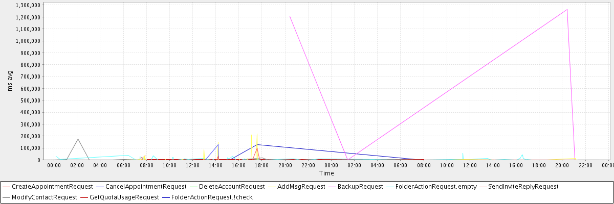 avg(CreateAppointmentRequest) = 2780.34 avg(CancelAppointmentRequest) = 43587.33 avg(DeleteAccountRequest) = 7279.00 avg(AddMsgRequest) = 3235.46 avg(BackupRequest) = 616662.50 avg(FolderActionRequest.empty) = 6433.52 avg(SendInviteReplyRequest) = 16691.50 avg(ModifyContactRequest) = 4648.49 avg(GetQuotaUsageRequest) = 3171.00 avg(FolderActionRequest.!check) = 9235.64