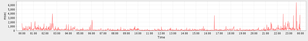 avg(SyncGalRequest) = 20995.18 avg(GetFreeBusyRequest) = 2148.70 avg(BackupRequest) = 650165.00 avg(FolderActionRequest.empty) = 7987.08 avg(FolderActionRequest.sync) = 6386.75 avg(BackupQueryRequest) = 966.20 avg(GetMiniCalRequest) = 961.16 avg(GetQuotaUsageRequest) = 2899.00 avg(ConvActionRequest.delete) = 1558.69 avg(ItemActionRequest.delete) = 13657.20