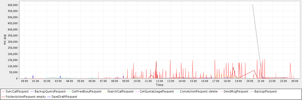 avg(SyncGalRequest) = 7007.01 avg(BackupQueryRequest) = 640.80 avg(GetFreeBusyRequest) = 937.44 avg(SearchGalRequest) = 1832.94 avg(GetQuotaUsageRequest) = 2963.00 avg(ConvActionRequest.delete) = 437.68 avg(SendMsgRequest) = 698.72 avg(BackupRequest) = 303811.50 avg(FolderActionRequest.empty) = 11739.03 avg(SaveDraftRequest) = 422.24
