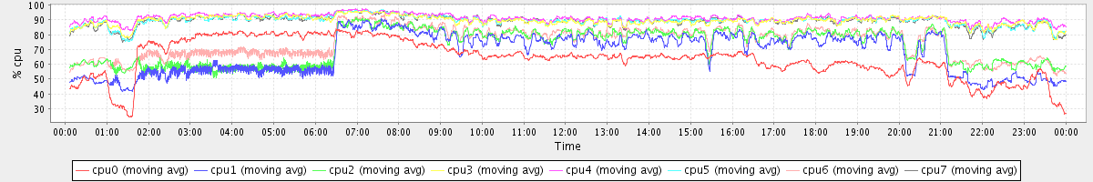 avg(cpu0) = 64.00 avg(cpu1) = 67.73 avg(cpu2) = 72.43 avg(cpu3) = 89.57 avg(cpu4) = 91.32 avg(cpu5) = 89.66 avg(cpu6) = 75.06 avg(cpu7) = 89.33