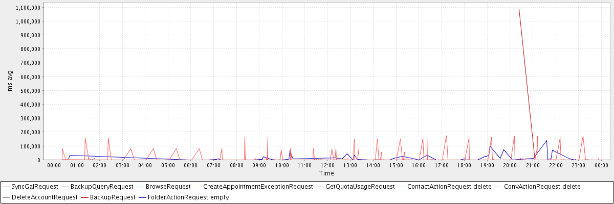 avg(SyncGalRequest) = 12281.43 avg(BackupQueryRequest) = 792.00 avg(BrowseRequest) = 688.00 avg(CreateAppointmentExceptionRequest) = 610.00 avg(GetQuotaUsageRequest) = 3036.00 avg(ContactActionRequest.delete) = 657.00 avg(ConvActionRequest.delete) = 1071.19 avg(DeleteAccountRequest) = 6914.75 avg(BackupRequest) = 542253.50 avg(FolderActionRequest.empty) = 14129.76