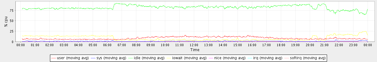 avg(user) = 8.34 avg(sys) = 1.11 avg(idle) = 81.82 avg(iowait) = 8.40 avg(nice) = 0.00 avg(irq) = 0.03 avg(softirq) = 0.29