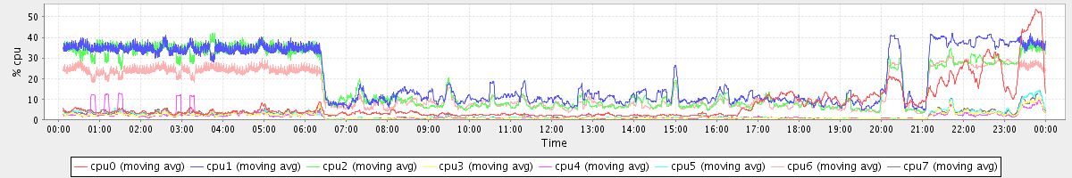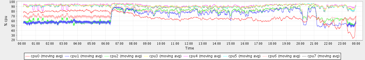 avg(cpu0) = 7.25 avg(cpu1) = 20.52 avg(cpu2) = 17.87 avg(cpu3) = 1.58 avg(cpu4) = 1.65 avg(cpu5) = 1.98 avg(cpu6) = 14.35 avg(cpu7) = 2.00