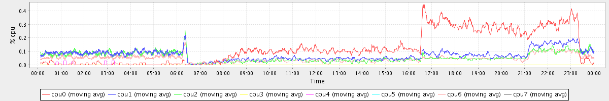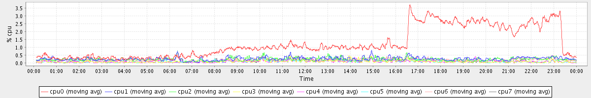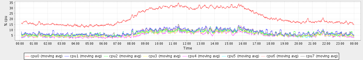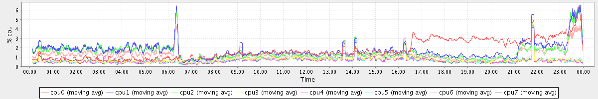 avg(cpu0) = 1.23 avg(cpu1) = 0.26 avg(cpu2) = 0.23 avg(cpu3) = 0.10 avg(cpu4) = 0.09 avg(cpu5) = 0.09 avg(cpu6) = 0.19 avg(cpu7) = 0.10