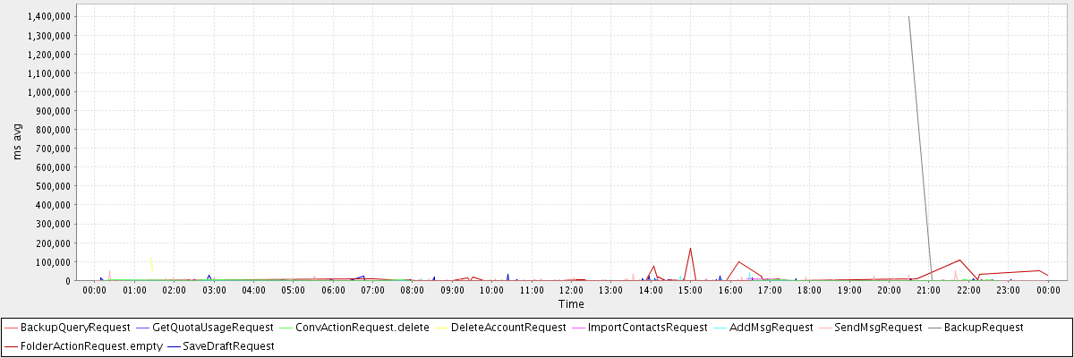 avg(BackupQueryRequest) = 865.80 avg(GetQuotaUsageRequest) = 2982.00 avg(ConvActionRequest.delete) = 903.70 avg(DeleteAccountRequest) = 84693.50 avg(ImportContactsRequest) = 6184.00 avg(AddMsgRequest) = 447.88 avg(SendMsgRequest) = 874.98 avg(BackupRequest) = 698837.50 avg(FolderActionRequest.empty) = 11318.35 avg(SaveDraftRequest) = 491.81
