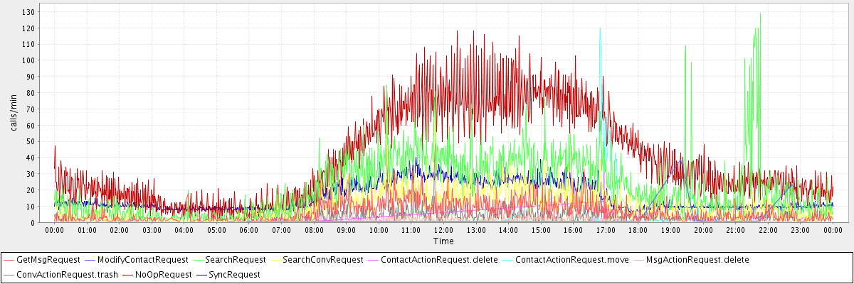 max(GetMsgRequest) = 33.00 max(ModifyContactRequest) = 39.00 max(SearchRequest) = 129.00 max(SearchConvRequest) = 71.00 max(ContactActionRequest.delete) = 35.00 max(ContactActionRequest.move) = 120.00 max(MsgActionRequest.delete) = 47.00 max(ConvActionRequest.trash) = 49.00 max(NoOpRequest) = 118.00 max(SyncRequest) = 40.00