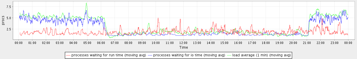 avg(processes waiting for run time) = 1.01 avg(processes waiting for io time) = 2.06 avg(load average (1 min)) = 3.08