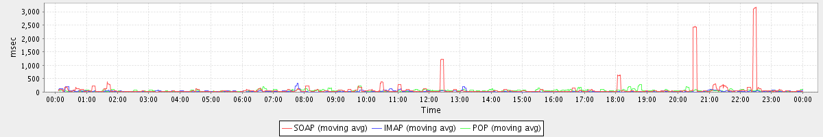 max(GetMsgRequest) = 27.00 max(GetAppointmentRequest) = 229.00 max(SearchRequest) = 63.00 max(SearchConvRequest) = 31.00 max(MsgActionRequest.move) = 31.00 max(MsgActionRequest.delete) = 193.00 max(ItemActionRequest.delete) = 208.00 max(ConvActionRequest.trash) = 17.00 max(NoOpRequest) = 44.00 max(SyncRequest) = 31.00