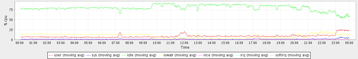avg(user) = 8.70 avg(sys) = 1.38 avg(idle) = 80.04 avg(iowait) = 9.40 avg(nice) = 0.00 avg(irq) = 0.04 avg(softirq) = 0.44
