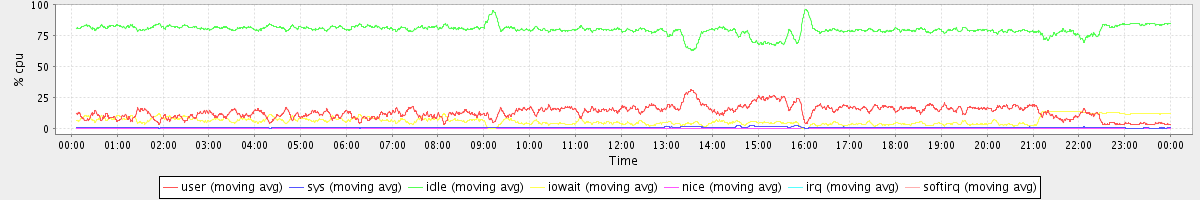 avg(user) = 13.14 avg(sys) = 0.86 avg(idle) = 79.68 avg(iowait) = 6.29 avg(nice) = 0.00 avg(irq) = 0.00 avg(softirq) = 0.01