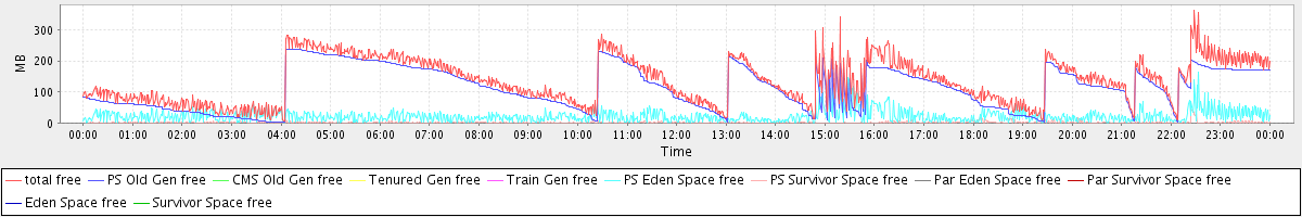 avg(total) = 364.12 avg(PS Old Gen) = 336.79 avg(CMS Old Gen) = 0.00 avg(Tenured Gen) = 0.00 avg(Train Gen) = 0.00 avg(PS Eden Space) = 24.01 avg(PS Survivor Space) = 3.33 avg(Par Eden Space) = 0.00 avg(Par Survivor Space) = 0.00 avg(Eden Space) = 0.00 avg(Survivor Space) = 0.00