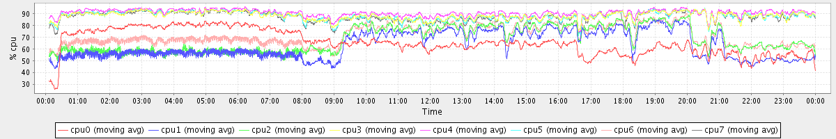 avg(cpu0) = 65.31 avg(cpu1) = 63.21 avg(cpu2) = 68.15 avg(cpu3) = 88.16 avg(cpu4) = 90.54 avg(cpu5) = 88.08 avg(cpu6) = 71.45 avg(cpu7) = 87.46