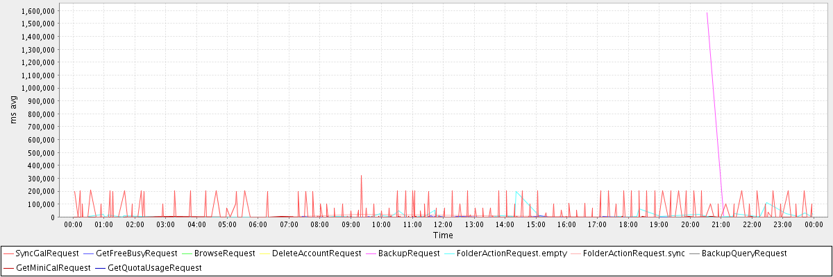 avg(SyncGalRequest) = 17469.88 avg(GetFreeBusyRequest) = 1071.53 avg(BrowseRequest) = 802.00 avg(DeleteAccountRequest) = 288811.00 avg(BackupRequest) = 795254.50 avg(FolderActionRequest.empty) = 11151.94 avg(FolderActionRequest.sync) = 4795.75 avg(BackupQueryRequest) = 1216.33 avg(GetMiniCalRequest) = 945.76 avg(GetQuotaUsageRequest) = 2959.00