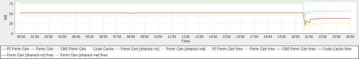 avg(PS Perm Gen) = 0.00 avg(Perm Gen) = 0.00 avg(CMS Perm Gen) = 74.49 avg(Code Cache) = 42.78 avg(Perm Gen [shared-ro]) = 0.00 avg(Perm Gen [shared-rw]) = 0.00 avg(PS Perm Gen free) = 0.00 avg(Perm Gen free) = 0.00 avg(CMS Perm Gen free) = 49.91 avg(Code Cache free) = 0.07 avg(Perm Gen [shared-ro] free) = 0.00 avg(Perm Gen [shared-rw] free) = 0.00