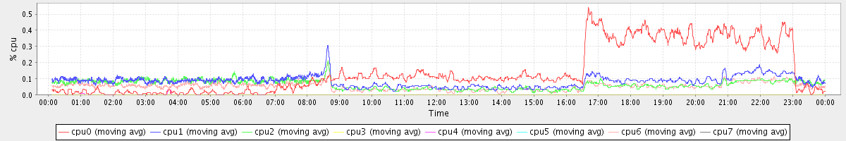 avg(cpu0) = 1.37 avg(cpu1) = 0.30 avg(cpu2) = 0.27 avg(cpu3) = 0.14 avg(cpu4) = 0.11 avg(cpu5) = 0.12 avg(cpu6) = 0.23 avg(cpu7) = 0.12