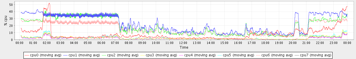 avg(cpu0) = 8.08 avg(cpu1) = 22.75 avg(cpu2) = 18.95 avg(cpu3) = 2.44 avg(cpu4) = 1.81 avg(cpu5) = 2.60 avg(cpu6) = 16.04 avg(cpu7) = 2.04