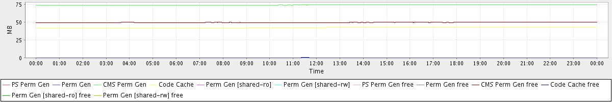 avg(PS Perm Gen) = 0.00 avg(Perm Gen) = 0.00 avg(CMS Perm Gen) = 73.93 avg(Code Cache) = 42.12 avg(Perm Gen [shared-ro]) = 0.00 avg(Perm Gen [shared-rw]) = 0.00 avg(PS Perm Gen free) = 0.00 avg(Perm Gen free) = 0.00 avg(CMS Perm Gen free) = 49.52 avg(Code Cache free) = 0.07 avg(Perm Gen [shared-ro] free) = 0.00 avg(Perm Gen [shared-rw] free) = 0.00