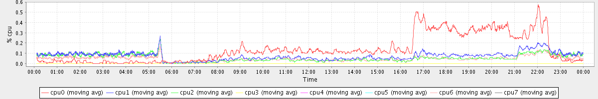 avg(cpu0) = 1.33 avg(cpu1) = 0.29 avg(cpu2) = 0.26 avg(cpu3) = 0.13 avg(cpu4) = 0.12 avg(cpu5) = 0.12 avg(cpu6) = 0.22 avg(cpu7) = 0.13