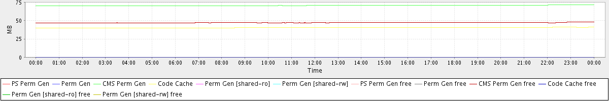avg(PS Perm Gen) = 0.00 avg(Perm Gen) = 0.00 avg(CMS Perm Gen) = 70.57 avg(Code Cache) = 40.37 avg(Perm Gen [shared-ro]) = 0.00 avg(Perm Gen [shared-rw]) = 0.00 avg(PS Perm Gen free) = 0.00 avg(Perm Gen free) = 0.00 avg(CMS Perm Gen free) = 47.21 avg(Code Cache free) = 0.08 avg(Perm Gen [shared-ro] free) = 0.00 avg(Perm Gen [shared-rw] free) = 0.00