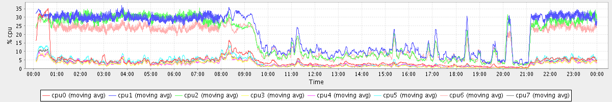avg(cpu0) = 35.28 avg(cpu1) = 25.95 avg(cpu2) = 26.10 avg(cpu3) = 24.55 avg(cpu4) = 23.43 avg(cpu5) = 27.42 avg(cpu6) = 26.00 avg(cpu7) = 27.98