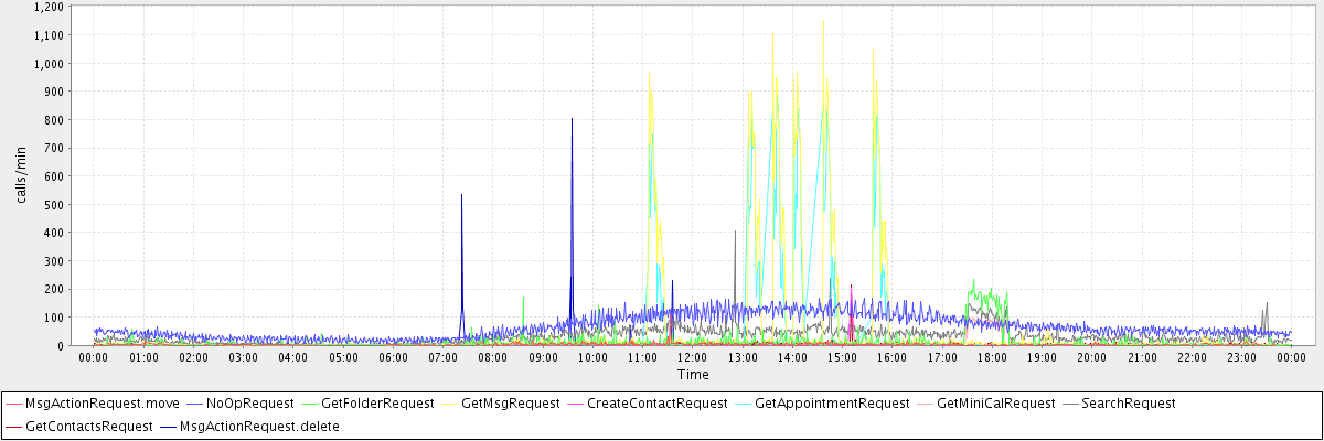 max(MsgActionRequest.move) = 109.00 max(NoOpRequest) = 168.00 max(GetFolderRequest) = 233.00 max(GetMsgRequest) = 1150.00 max(CreateContactRequest) = 203.00 max(GetAppointmentRequest) = 890.00 max(GetMiniCalRequest) = 102.00 max(SearchRequest) = 406.00 max(GetContactsRequest) = 214.00 max(MsgActionRequest.delete) = 804.00