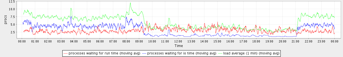 avg(processes waiting for run time) = 2.77 avg(processes waiting for io time) = 2.60 avg(load average (1 min)) = 5.72