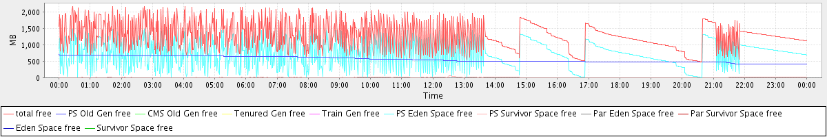 avg(total free) = 1281.75 avg(PS Old Gen free) = 555.97 avg(CMS Old Gen free) = 0.00 avg(Tenured Gen free) = 0.00 avg(Train Gen free) = 0.00 avg(PS Eden Space free) = 719.07 avg(PS Survivor Space free) = 6.71 avg(Par Eden Space free) = 0.00 avg(Par Survivor Space free) = 0.00 avg(Eden Space free) = 0.00 avg(Survivor Space free) = 0.00