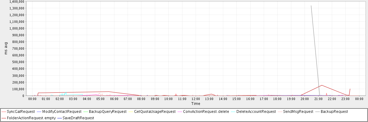 avg(SyncGalRequest) = 285.68 avg(ModifyContactRequest) = 474.43 avg(BackupQueryRequest) = 354.25 avg(GetQuotaUsageRequest) = 3122.00 avg(ConvActionRequest.delete) = 688.31 avg(DeleteAccountRequest) = 13275.44 avg(SendMsgRequest) = 619.75 avg(BackupRequest) = 667823.00 avg(FolderActionRequest.empty) = 10665.28 avg(SaveDraftRequest) = 209.51