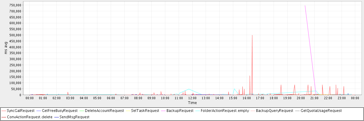 avg(SyncGalRequest) = 2273.74 avg(GetFreeBusyRequest) = 1115.20 avg(DeleteAccountRequest) = 2230.00 avg(SetTaskRequest) = 369.12 avg(BackupRequest) = 375851.50 avg(FolderActionRequest.empty) = 5743.84 avg(BackupQueryRequest) = 473.40 avg(GetQuotaUsageRequest) = 3078.00 avg(ConvActionRequest.delete) = 521.49 avg(SendMsgRequest) = 347.74